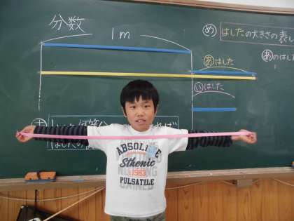 両手を広げた長さを,1mの長さをもとに考えました。1mと「はした」と考えた時,「はした」が1mのどのくらいにあたるか予想しました。「半分におったくらいかな」「半分より短い」「4分の1よりは長い」ということから,2年生の時に学習した分数で表せることが分かりました。