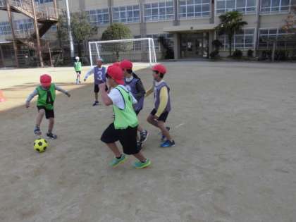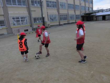 体育科の学習で,「ボール蹴りゲーム」をしました。ゲームをしている中で,「もっとこうしたほうがいい」という意見を出し合い,オリジナルのルールでゲームをしました。