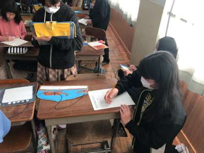 図工で「糸のこスイスイ」の作品鑑賞を行いました。色の使い方や切り方,ホワイトボードの付け方などに注目して鑑賞しました。「このアイデアは無かった!」と感じる子や,「次の参考にしたい!!」という気持ちを持っている人もいました。