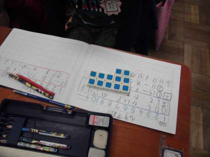 算数科「ひきざん(2)」では,12−7の計算の仕方を説明する学習をしました。12を10と2に分けて,10のかたまりから7を引く方法を自分の言葉で話すようにしました。