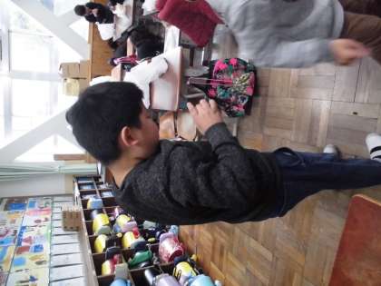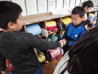 生活科「みんなであそぼう はる なつ あき ふゆ」では,秋探しで見つけたものを使った遊びをしました。床に置いたどんぐりを目がけてどんぐりを落としたり,手の中に隠したどんぐりの数を言い当てたりと,簡単なルールでも楽しく遊んでいました。