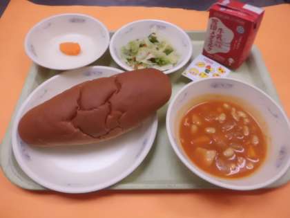 大豆と鶏肉のトマト煮は,児童に人気の献立です。パンとの相性も良くおいしかったです。