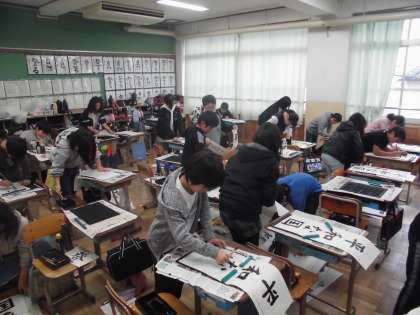 いつもの大きさの半紙ではなく,縦長の画仙紙に書きます。