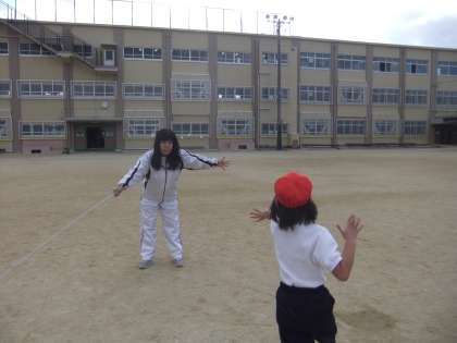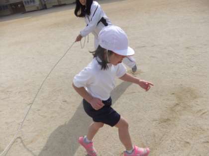 体育の時間に大繩遊びをしました。大波小波を跳んだり,縄をくぐったりする練習をしました。上手にくぐる子もいましたが,縄をくぐる時,縄に当たると思いなかなか一歩が踏み出せない子がいました。続けて練習して頑張ります。