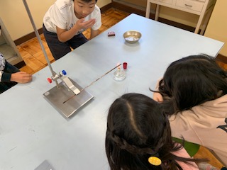 グループごとに温めはじめる場所を変え,ろうの溶ける様子から金属の温まり方を考察しました。金属は熱せられたところから順に,遠くの方へと温まっていくことが分かりました。