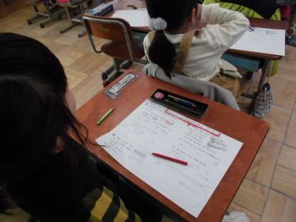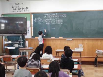 算数科では,「たすのかな,ひくのかな」の学習がスタート。問題文からたし算になるのか,ひき算になのかを決定する言葉を探していく子どもたち。見つけた言葉をもとに,考えた式をみんなに紹介していきました。