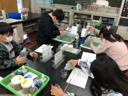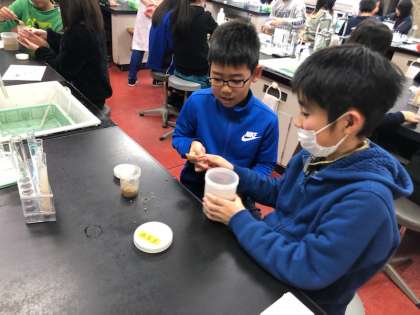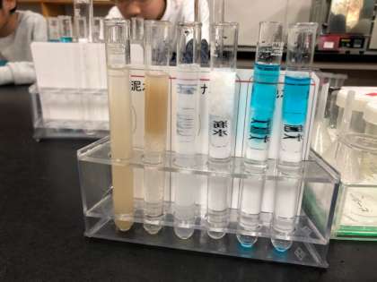 汚れた水(泥水,石けん水,色水)を「水道水」と「海水」に入れたらどうなるのかを観察しました。海水に入れた泥水と石けん水は,泥や石けんが固まり,沈む様子が見られました。特に石けんが固まった様子は,子ども達にとっても印象的なようでした。
