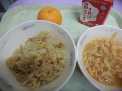 カレーピラフは,ツナ缶や乾燥玉ねぎ・乾燥人参などを使って作りました。乾燥されていても,しっかりと野菜の甘さを感じる事ができ,児童にも好評でした。