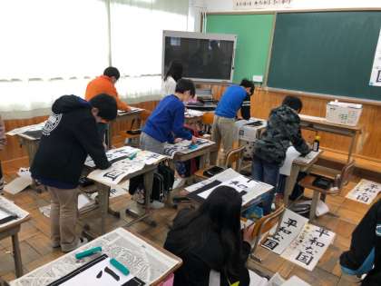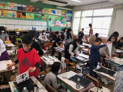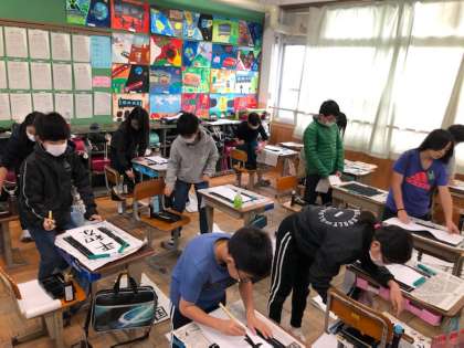 書写の時間に画仙紙に「平和の国」という言葉を書きました。最初は慣れなかった画仙紙も,今ではバランスをとって文字を書くことが上手になりました。