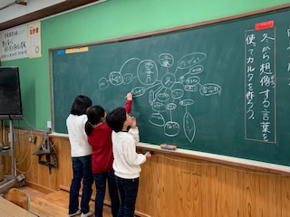 「冬の風景」の学習で「冬」という言葉から想像する言葉を集めました。友だちの意見を活かして,