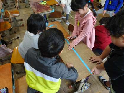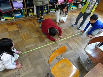 1mと思うところでテープを切って長さを測りました。「長すぎた〜!」「1mってこのくらいの長さなのか。」など子どもたちの色々な呟きが聞こえてきました。