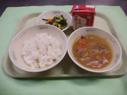 カレーは,給食室でルウから作りました。児童からは「カレーの味がしっかりしていておいしかった」「バターの味がしておいしかった」などの声を聞かせてくれました。