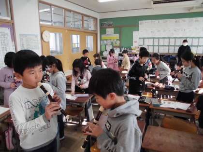 お囃子のような音楽を自分で作るために「ラ」と「ド」と「レ」だけを使って旋律づくりに挑戦。「ターン・ターン・タン・タン・タン・ウン」のリズムに音をあてはめて作った旋律をリコーダーで演奏して友達と聴き合いました。授業の終わりには,作った旋律をみんなでリレーして演奏しました。