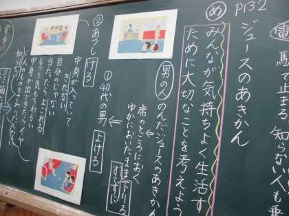 「みんなが気持ちよく生活するために大切なこと」について考えました。他人が飲んだ後の空き缶を電車の中に置いたまま降りてしまったら,その空き缶を自分ならどうするか。自分の方へ転がってきた空き缶をめぐって,いろいろな行動が出てきます。電車の中のこの出来事をもとに自分の生活を見つめ直し,学んだことを自分の生活に生かしていきます。