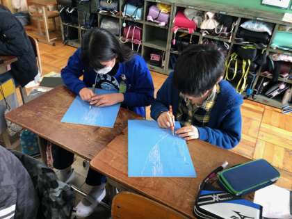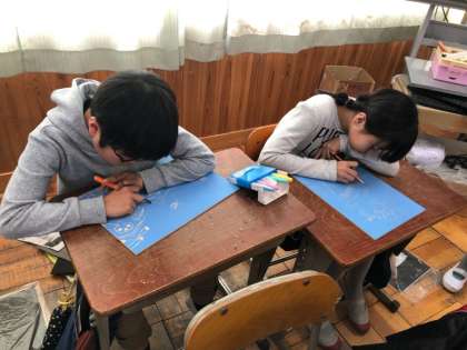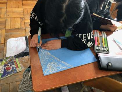 現在,彫刻刀を使って版画を彫り進めています。彫っていくうちにだんだんと上手くなり,最初より早く丁寧に彫ることができています。次から色をつけていきます。