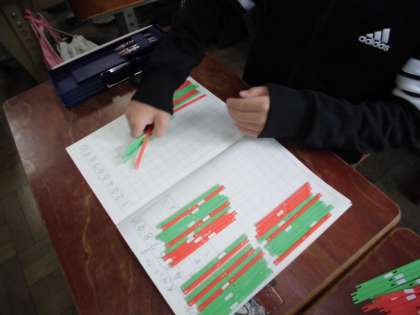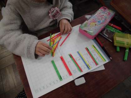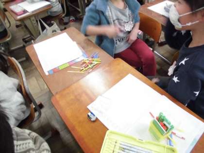 算数科「大きい かず」では,ペアでじゃんけんをして,数え棒を取り合いました。その後,たくさん取った数え棒の数が一目で分かるように並べ替えました。2本ずつ,5本ずつ,10本ずつと各自が工夫して並べる姿が印象的でした。