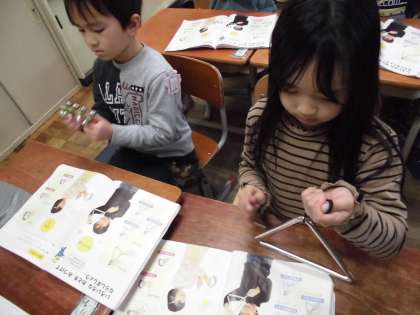 音楽科「いろいろなおとをたのしもう」では,鈴やトライアングルを使って,いろいろな音を出してみました。鈴を振る向きを変えたり,トライアングルの音が響いている間に次の音を出したりと,面白い工夫がたくさん見られました。