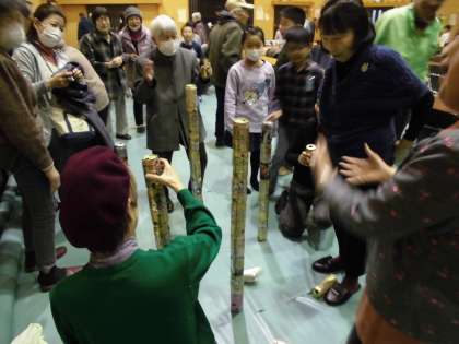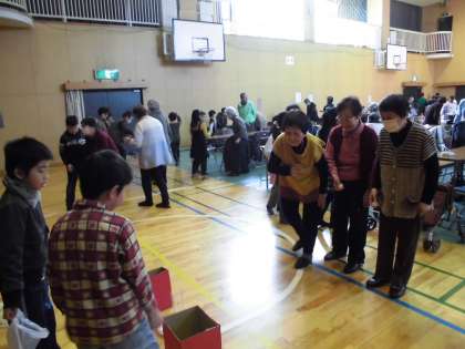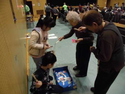 挨拶が終わると,子ども達が考えてきた遊びで交流を行います。今回は,座席で遊ぶだけではなく,輪投げや缶積み,的あてなど,席を離れて動く遊びも行いました。お年寄りの方々も,積極的に動いてくれて,そこかしこで笑顔の交流が生まれていました。