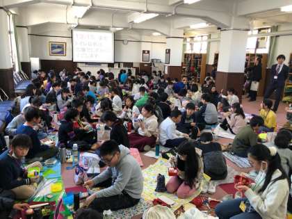 最初に集まった広間でお弁当を食べます。ブースごとに集まり,日常会話や仕事の会話をしながら食べました。早朝より,お弁当のご準備ありがとうございました。