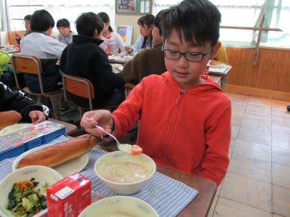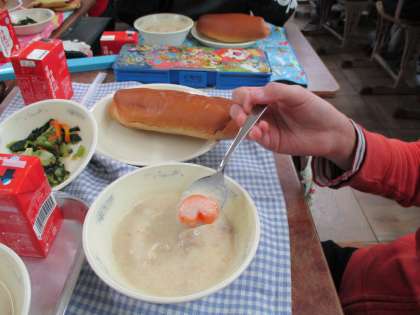 ホワイトシチューに,学級に1つだけ,車の形のにんじんが入っています。