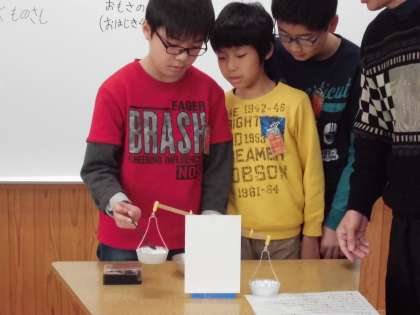 生単の「大きさ比べ」では各グループに分かれて,調理実習につながるような活動をしています。粘土や塩を使って,長さや重さ比べを頑張っています!