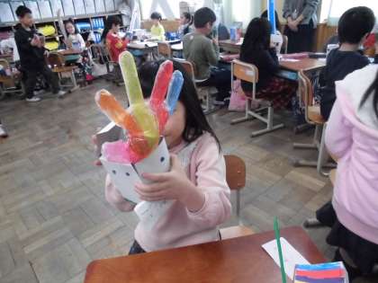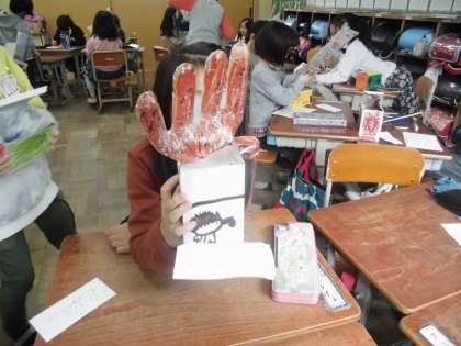 図画工作科「なにがでてくるかな!?」では,作品の鑑賞会をしました。友だちがぷ〜っとふくらまして,中から飛び出してくるものを楽しそうに見る子どもたちでした。