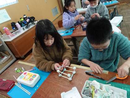 ストローと粘土を使って箱の形を作りました。辺はいくつかな?頂点はいくつかな?ペアで相談して頑張って作っていました。
