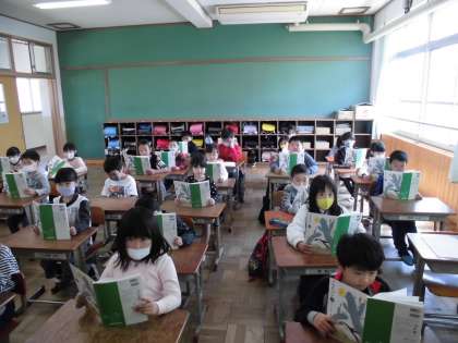 国語の教科書を受け取りました。かたに合わせて表紙をしっかりと折り曲げる子どもたち。そのあと,「たんぽぽ」の詩をみんなで読みました。