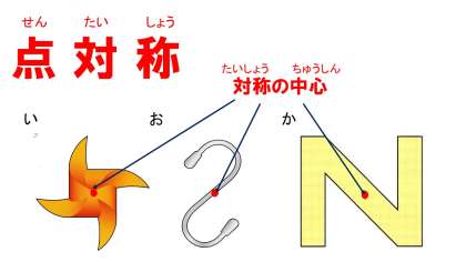 2つ目のグループが「点対称な図形」グループ!このグループの特徴は「ある点を中心にして180°まわすと,もとの形にピッタリ重なる」ということです。また,その中心を「対称の中心」といいます。いろんな形をクルクル回してみて,身の回りの「点対称な図形」を探してみるのも楽しいかもしれませんね。