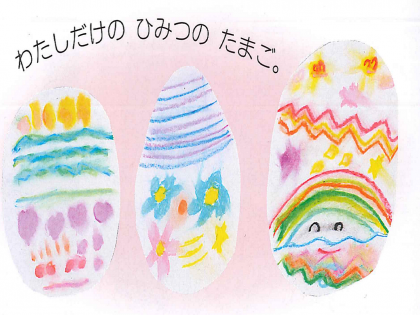 ずがこうさくかでとりくむ「ひみつのたまご」。かたちやいろをかんがえて,じぶんだけのたまごをつくります。さて,このたまごがわれたらなにがうまれるでしょうか?それもかんがえてみてくださいね。
