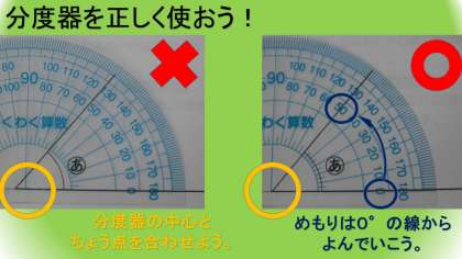1.分度器の中心と頂(ちょう)点をしっかり合わせる。