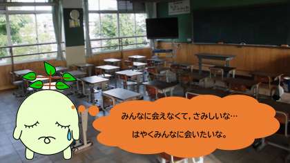 休校が長くつづき,みなさんの元気な声やすてきな笑顔が見られない学校は,すごく静かでさみしい感じがします。みなさんは,いつも『当たり前』のように学校に行っていたときのように,友だちと話したり,遊んだり,学習したりする日がはやくもどってきてほしい,と思っているのではないでしょうか。だれも何もできないのが本当にくやしいですが,あともう少しの時間,がまんですね。