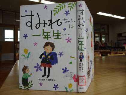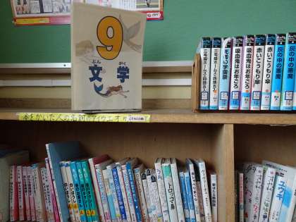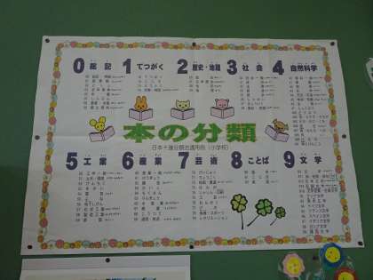 今日は学校図書館に来ました。「すみれちゃんは一年生」という本を探しています。本を探すときに便利なのが,どこにどんな種類の本があるかがかいてある表です。図書館の壁に貼ってあります。探している本は物語なので,「9 文学の本」を探してみましょう。ほら,簡単に見つけることができました!地域にある図書館でも同じように本は分けられています。ぜひ使ってみてください!
