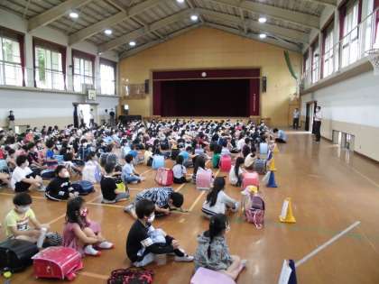 6月1日(月)から学校が再開。10時からは2・3・5年生が体育館に集まって,校長先生からのお話を聞きました。その後教室で,明日からの流れの話を聞いたり,生活の仕方についての映像を見たりしました。