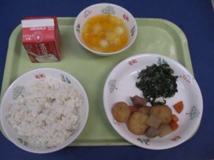 今日は大人気の「フルーツ白玉」が久しぶりに登場しました。最近は、フルーツを使う献立は食器の中で固まる「フルーツ寒天」の献立が多かったので、「フルーツ白玉」も固まると思って食べるのを待っていた子もいました。