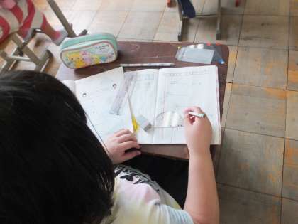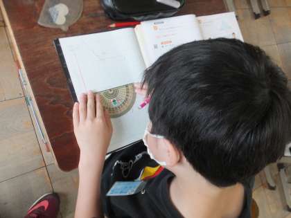 算数科の「角の大きさ」で,分度器を使って角をかく学習に取り組みました。30°や60°は慣れてきた子ども達も,200°や300°となると少し考えます。「180°より大きい角の測り方を使うと・・・」「300°ということは,270°から360°の間くらいだから・・・」「今は測っている0°の線は左からだから・・・」など,見通しをもち,分度器をしっかりと読みながら作業を進めると,しっかりとかけるようになってきました。