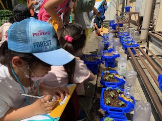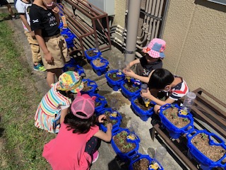 出てきた芽の色や形,手触りなどをじっくりと観察しました。