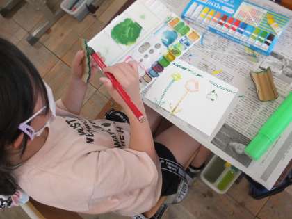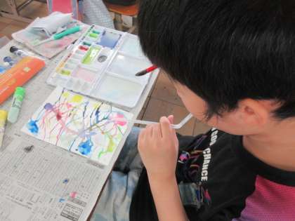 図画工作科の学習で,ストローを使って絵の具を吹き流したり,歯ブラシと金網でスパッタリングをしたり,段ボールの断面図を使ってスタンプのようにしたりと,筆以外で様々な模様づくりに取り組みました。