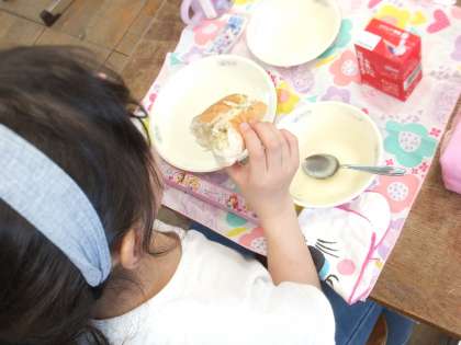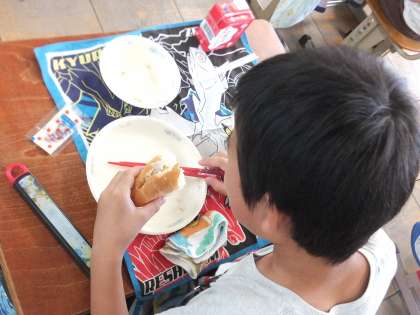 この日の給食では,コッペパンに具を挟んで,ツナサンドを作っていただきました。クラムチャウダーとツナサンドで洋風な給食を楽しみました。