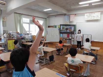 全員で取り組む国語学習。画面に映し出された画像を見て,質疑応答です。