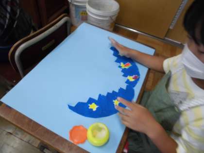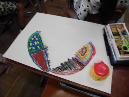 図画工作科「ふしぎな たまご」では,たまごがわれると何が生まれてくるのかを考え,クレヨンで描いていきました。花や動物,星など,子どもたちの自由な発想が光っていました。