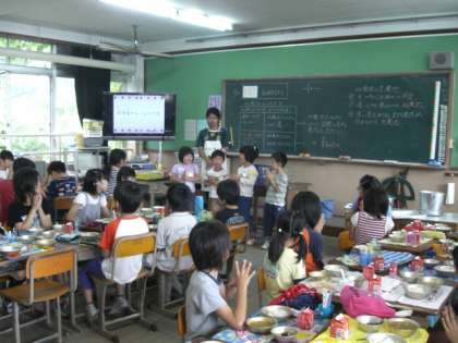 今日は「たてわり給食」でした。1年生から6年生まで同じ教室で給食を食べました。