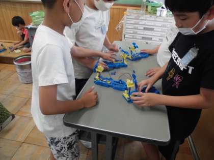 実際にモーターカーを組立て,電流の流れる向きを調べたり,モーターをもっと速く回すためにはどうすればよいか,考えてきました。