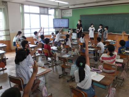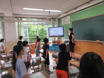 今年度初めてのALTの先生との外国語活動の学習がありました。先生は去年と同じモンタナ先生です。子どもたちはモンタナ先生と学習するのが大好きです。モンタナ先生の話す英語を注意深く聞いて,何を言われているのか考えたり,同じように発音できるようにしたりしていました。