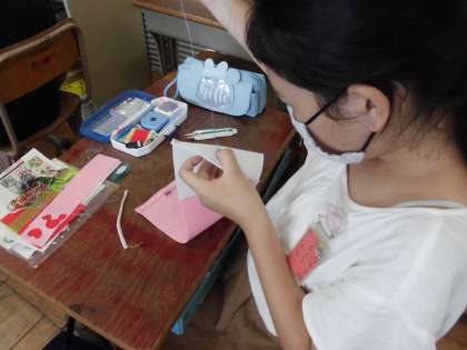 家庭科では,手縫いで小物を作っています。