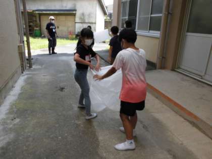 活動前にしっかり手洗い・うがいを行い,ペアで協力して,空気をビニール袋いっぱいにとじこめました。とじこめた空気を手で押すとどうなるか,2人で押し合ってみるとどんな感じがするか,考えながら調べることができました。