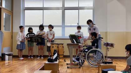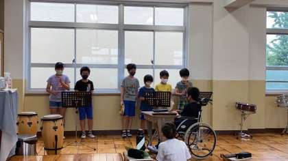 音楽室で打楽器を使ったリズムづくりの発表会をしていました。