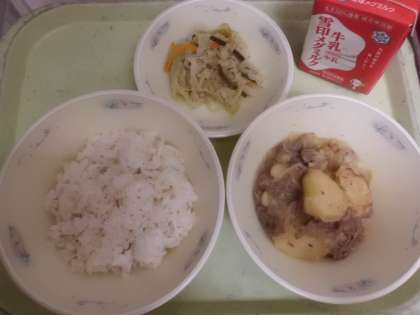 肉じゃがの肉は東日本では豚肉を使う家が多く,西日本では牛肉を使う家が多いそうです。京都では牛肉を使う家が多く,給食でも牛肉を使ったものを提供しています。肉じゃがは人気のメニューで「おかわりしたい!」という声を多く聞きました。