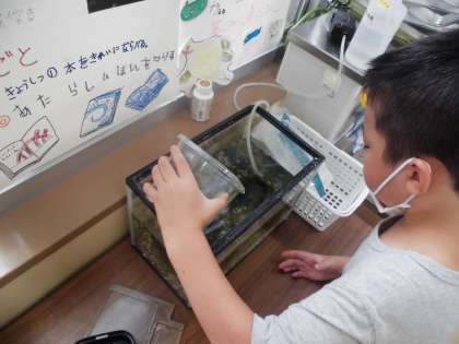 用務員さんに用具を借りに行ったり,新しい生き物を水槽に入れたりしました。