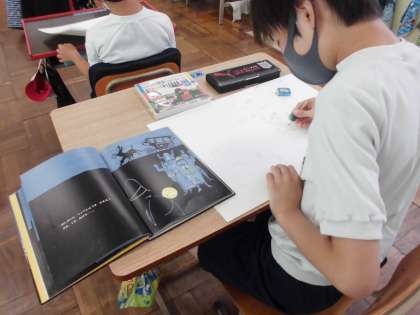本を見て,好きな場面を描いたり,想像して物語を作り,その場面を描いている子もいました。